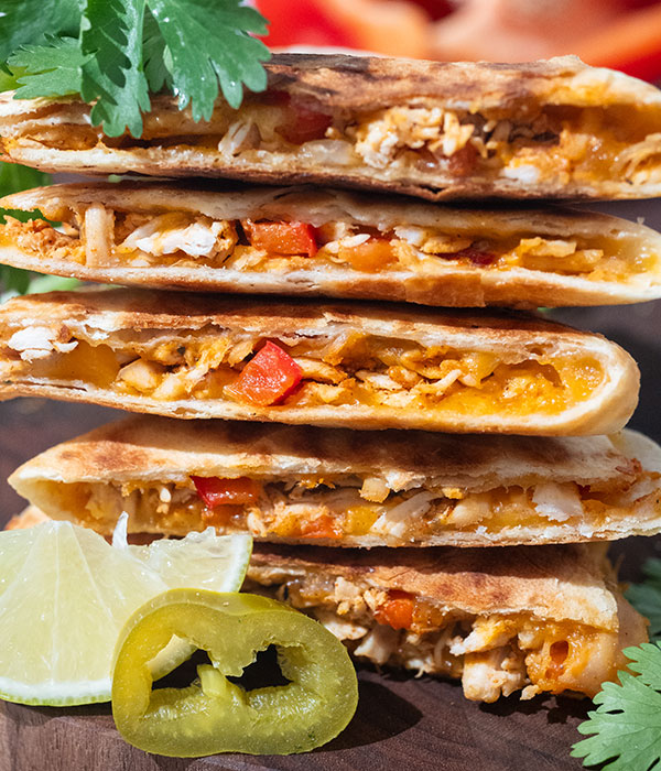 This Classic Chicken Quesadilla cuts down on prep time by using Heinen’s Daily Bites tender pulled chicken and Heinen’s fresh recipe ready vegetables. Mixed together and layered on a soft tortillas with Heinen’s shredded 4 cheese Mexican blend, you’ve got a perfect quesadilla in the making. Once toasted to golden perfection and cut into wedges, these quesadillas are ready to eat or dip.
