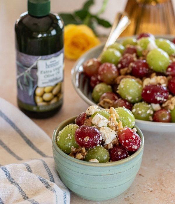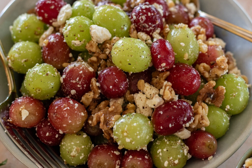 When the weather starts to warm up, this grape salad is the kind of fresh, effortless dish that fits right into spring and and summer. It brings together crisp red and green seedless grapes with creamy feta, a drizzle of olive oil, and a handful of crunchy walnuts for a blanace of sweet, salty, and refreshing flavors. This salad is light enough to sit alongside grilled favorites and simple enough to pull together for a last minute dinner or backyard get together.