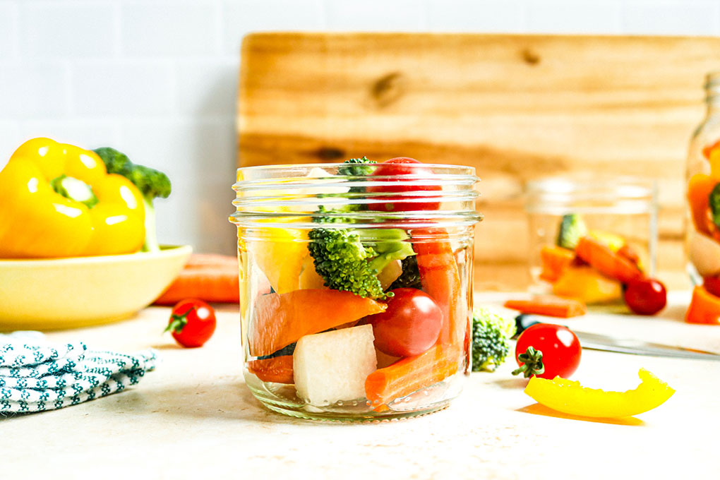 So, what exactly is a magic veggie jar? Picture a glass Mason jar filled with a variety of colorful raw vegetables that you prepare at the beginning of each week. And because you are investing the time to fill one jar, it only makes sense to prepare enough jars for the week (one for each day).